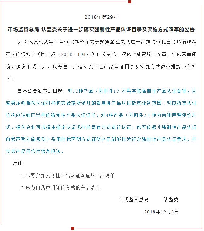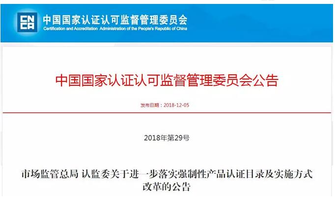 今天,国家认监委官网发布《关于进一步落实强制性产品认证目录及实施方式改革的公告》(2018年第29号公告),详情如下: